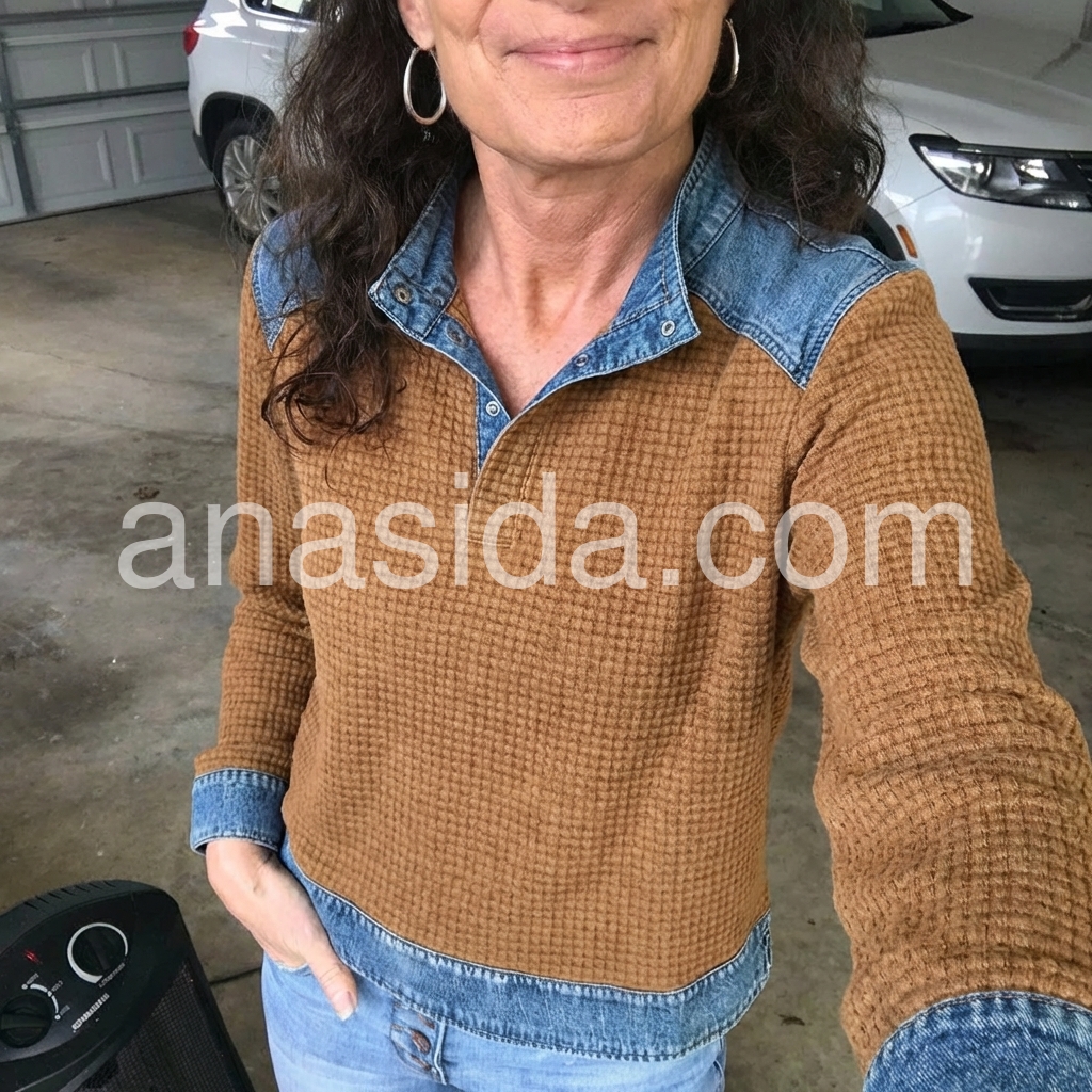 Crafted from premium denim, this long sleeve top features a sophisticated brown color block design that adds visual interest and versatility to your wardrobe. The structured fabric provides durability and maintains its shape through regular wear, while the extended sleeves offer practical coverage. The color blocking technique creates a modern silhouette that works seamlessly with both casual and elevated styling. Perfect for layering or wearing as a standalone piece, this top delivers timeless appeal with contemporary flair.