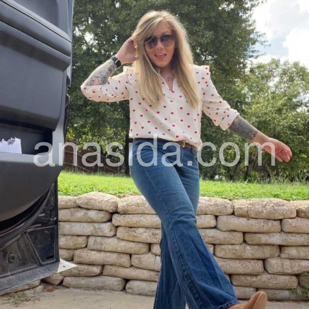 Take this lightweight red heart blouse anywhere with its fitted leg o’ mutton long sleeves with flared ruffles on the shoulders. The plunging fold-over v-neckline and fitted silhouette can be paired with high-waisted denim, slacks, or shorts. Finish your look with casual sneakers, sandals, and so much more. Wash in gentle or delicate cycle with light colors. Keep away from dark colors. The delicate fabric may absorb dark colors.