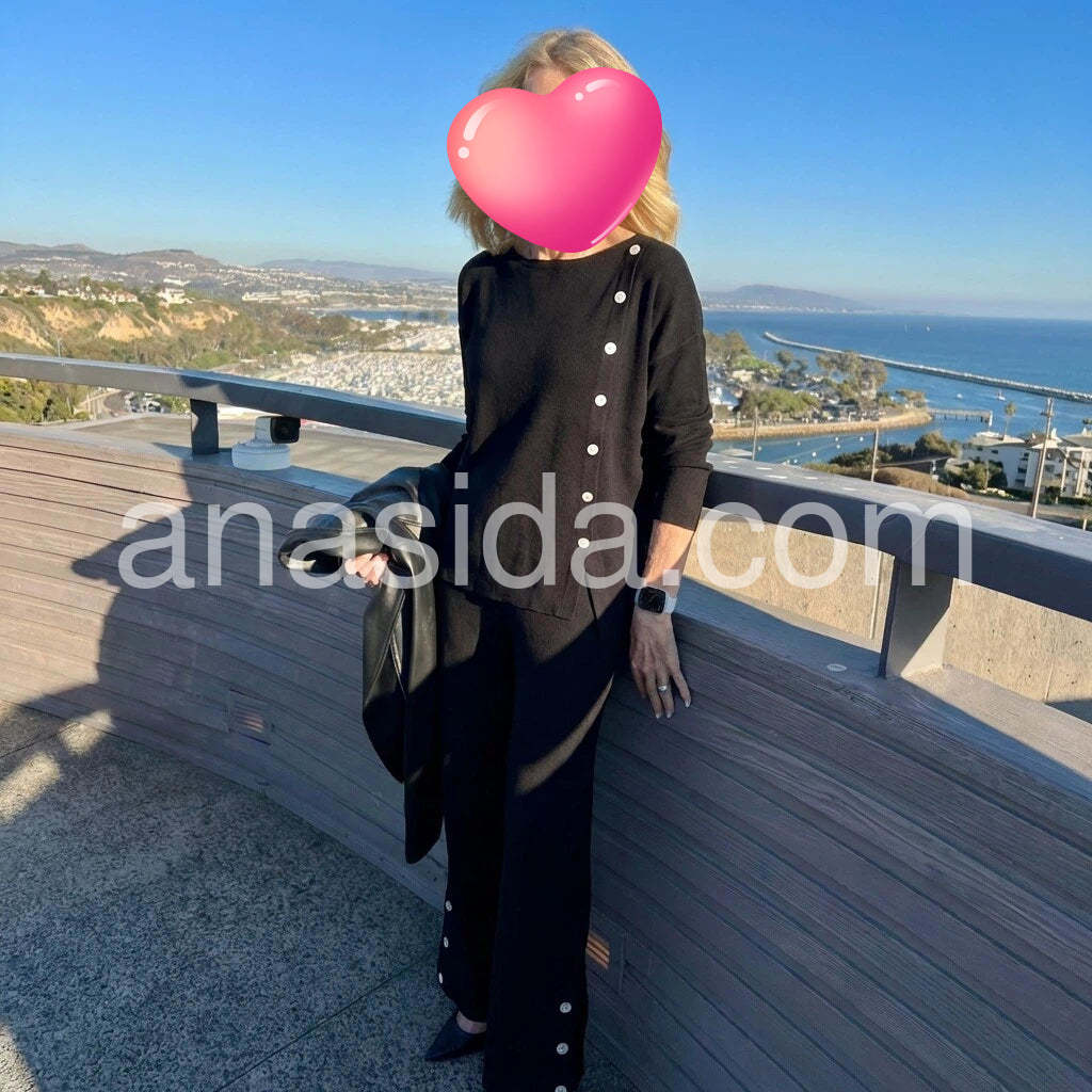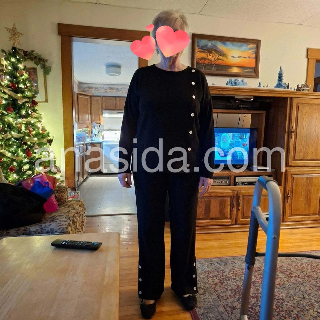 This modern two-piece set features a sleek black design and a classic round neckline. Enjoy the perfect combination of style and comfort with this versatile and timeless ensemble. Crafted with high-quality materials, this set is a must-have addition to your wardrobe. Elevate your fashion game today!