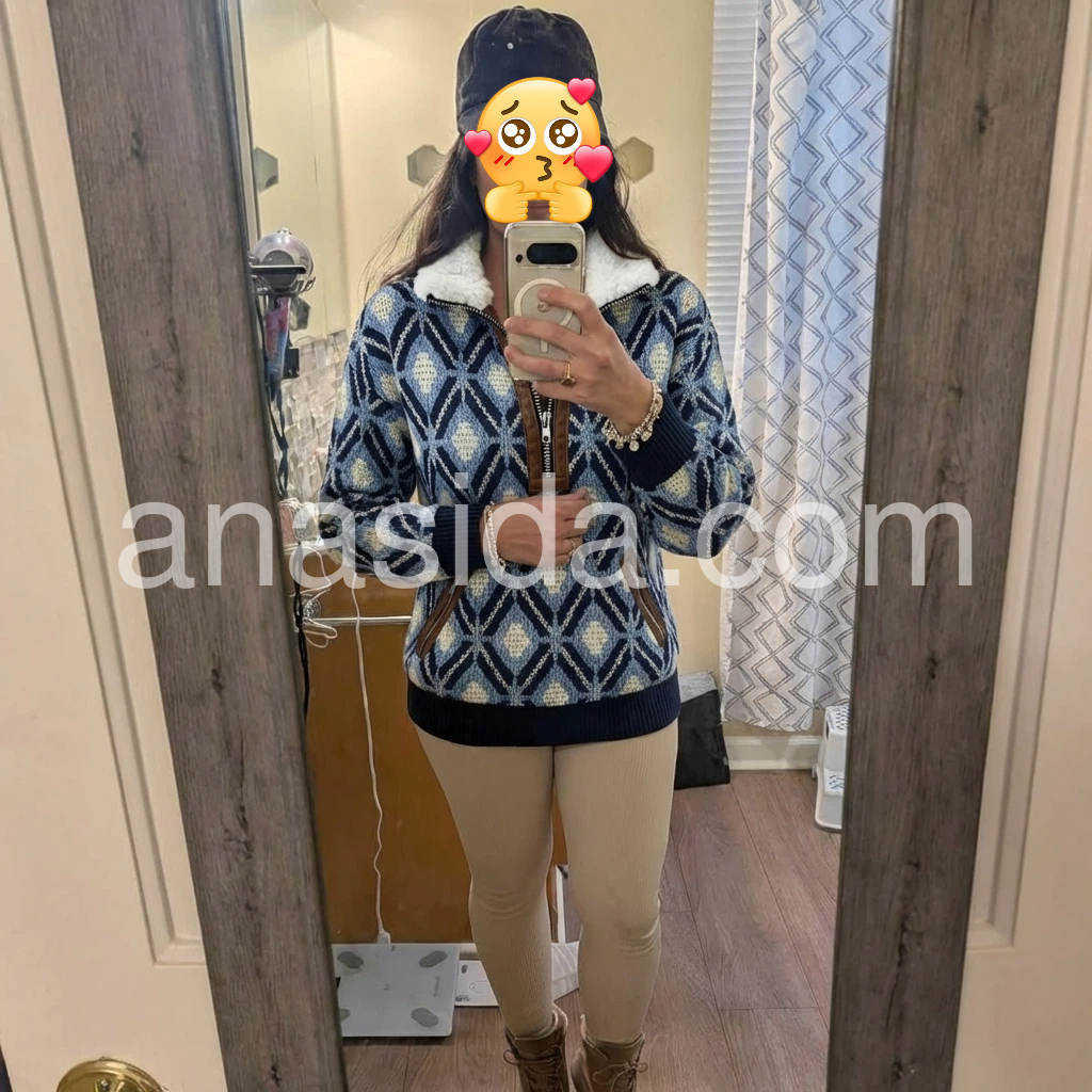 This sweater is the perfect blend of cozy and chic! The geometric pattern in shades of blue and white is so classic and timeless, and the fur collar makes it feel extra special. The leather trim on the zipper and pockets adds a nice detail that elevates the whole look. The fabric is soft and stretchy, so it’s comfortable to wear all day. I love pairing it with jeans and boots for a casual, outdoorsy look. It’s quickly become my go-to for cool weekends!