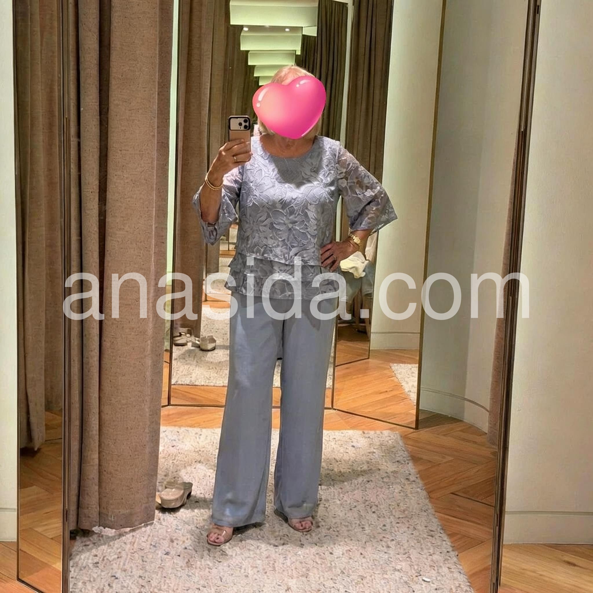 Elegant and timeless. The pale blue suit drapes beautifully, and the matching pants are roomy without looking sloppy. Great for weddings, luncheons, or work events. The fabric feels breathable and moves well all day.